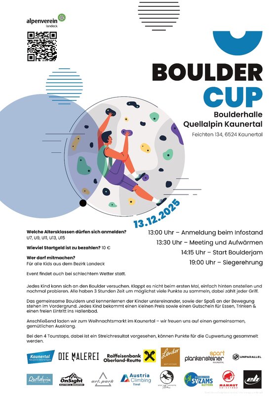 Geklettert wird im Kaunertal an der Boulderwand in der Boulderhalle im Quellalpin. Wer gerne an diesem Bouldercup teilnehmen mmöchte, kann sich gerne direkt jedem Event anmelden. Das Nenngeld beträgt € 10,- pro Person. Mitmachen können Kinder und Jugendliche aus dem Bezirk Landeck.