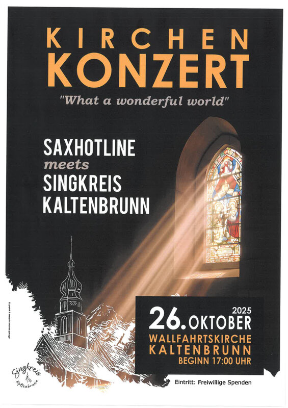 Unter dem Titel „What a Wonderful World“ erwartet Sie in der Wallfahrtskirche Kaltenbrunn ein abwechslungsreiches Kirchenkonzert gemeinsam mit der Saxhotline und dem Singkreis Kaltenrbunn voller musikalischer Wärme und inspirierender Klänge. Genießen Sie bekannte Melodien und besinnliche Werke, die Herz und Seele berühren.