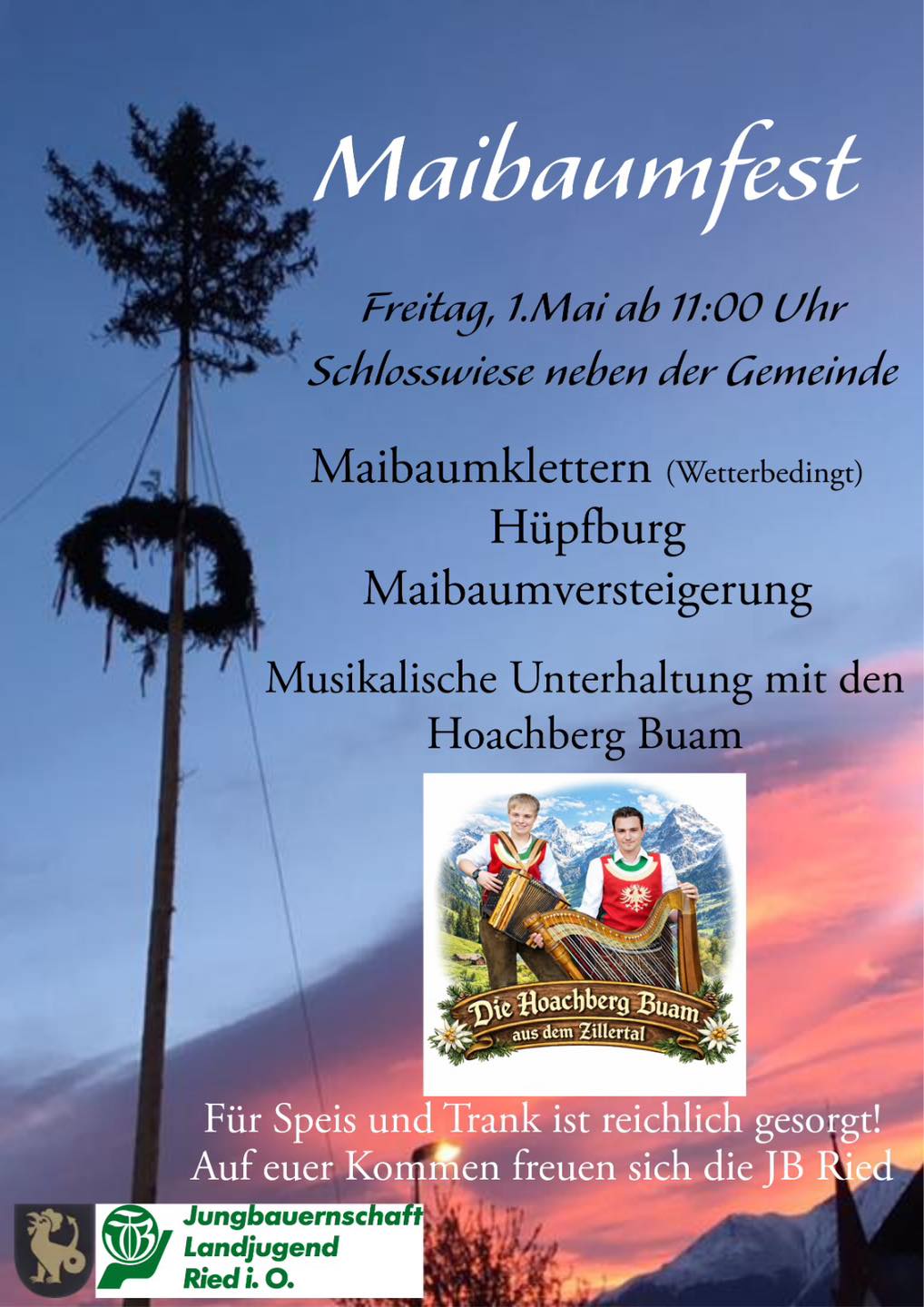 Am 1. Mai lädt das Maibaumfest in Ried auf die Schlosswiese ein. Freut euch auf traditionelle Highlights wie Maibaumklettern, Hüpfburg und Maibaumversteigerung. Für beste Stimmung sorgen die „Hoachberg Buam“, während für Speis und Trank bestens gesorgt ist.